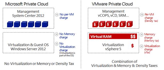 With WS 2012, Microsoft's licensing cost advantage holds (6X-15X less expensive depending on VM density) and there is no tax charge on any virtualization, memory, or density like VMware. Moreover, with Microsoft's WS 2012 Hyper-V, there is a product that VMware cannot even match.